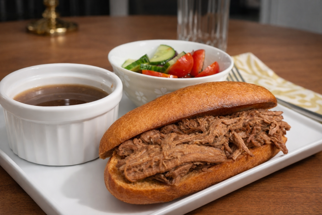 Put the meat in the bun and serve with au jus. Enjoy!